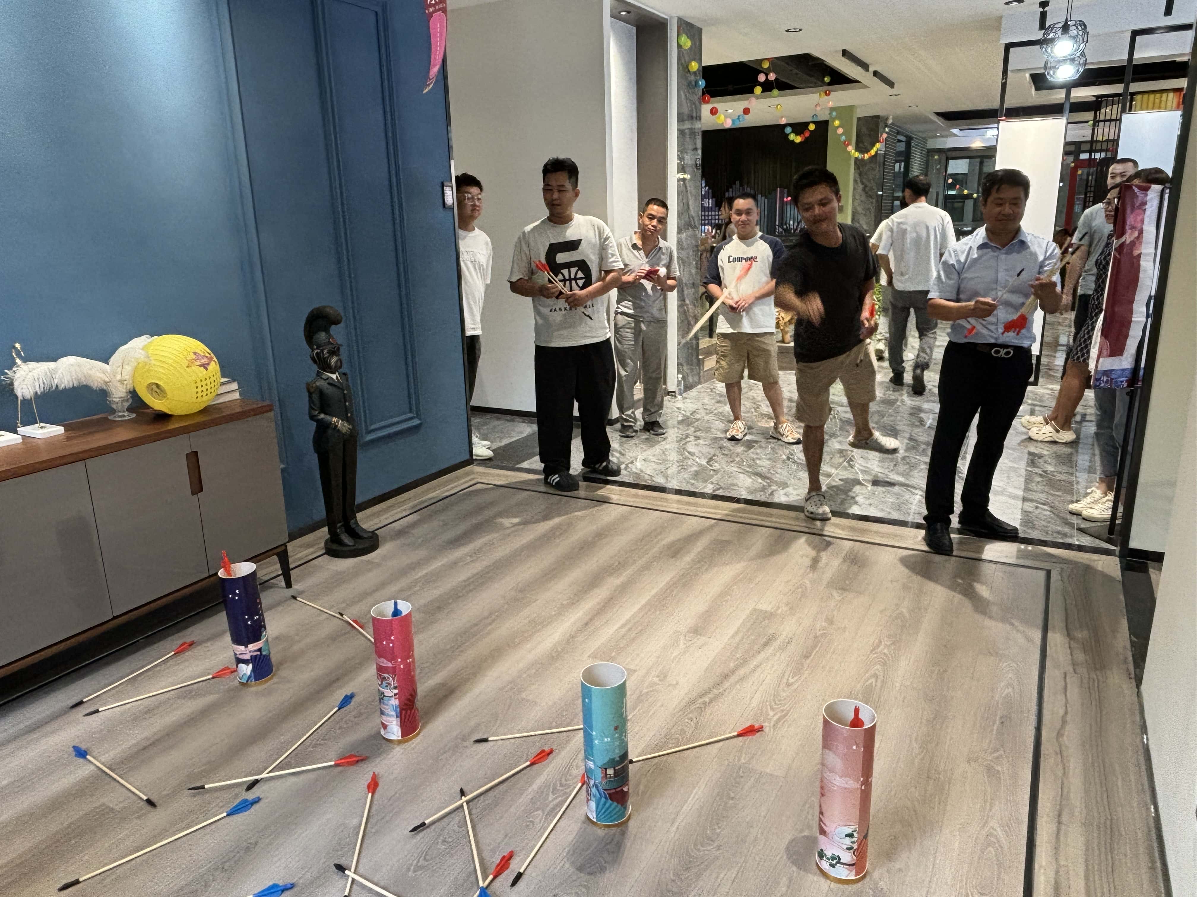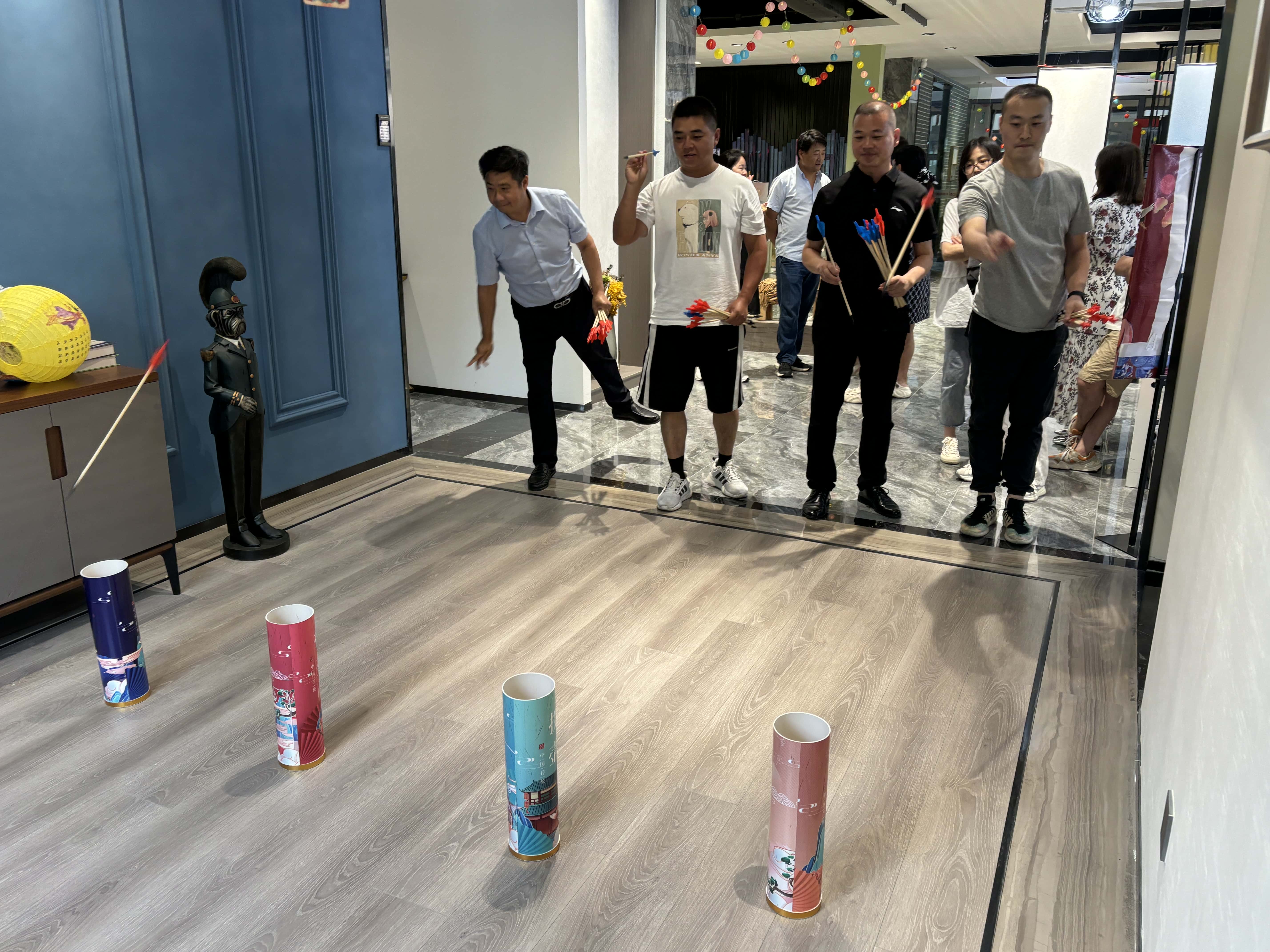 投壶游戏区更是重现了古时的雅趣。修长的箭矢在员工们的手中轻轻飞出,带着一种优雅的力量,朝着壶口奔去。每一次箭矢与壶身的触碰,都像是在诉说着古老与现代的对话,让人不禁遥想起古人在庭院中进行投壶游戏时的风雅之景。