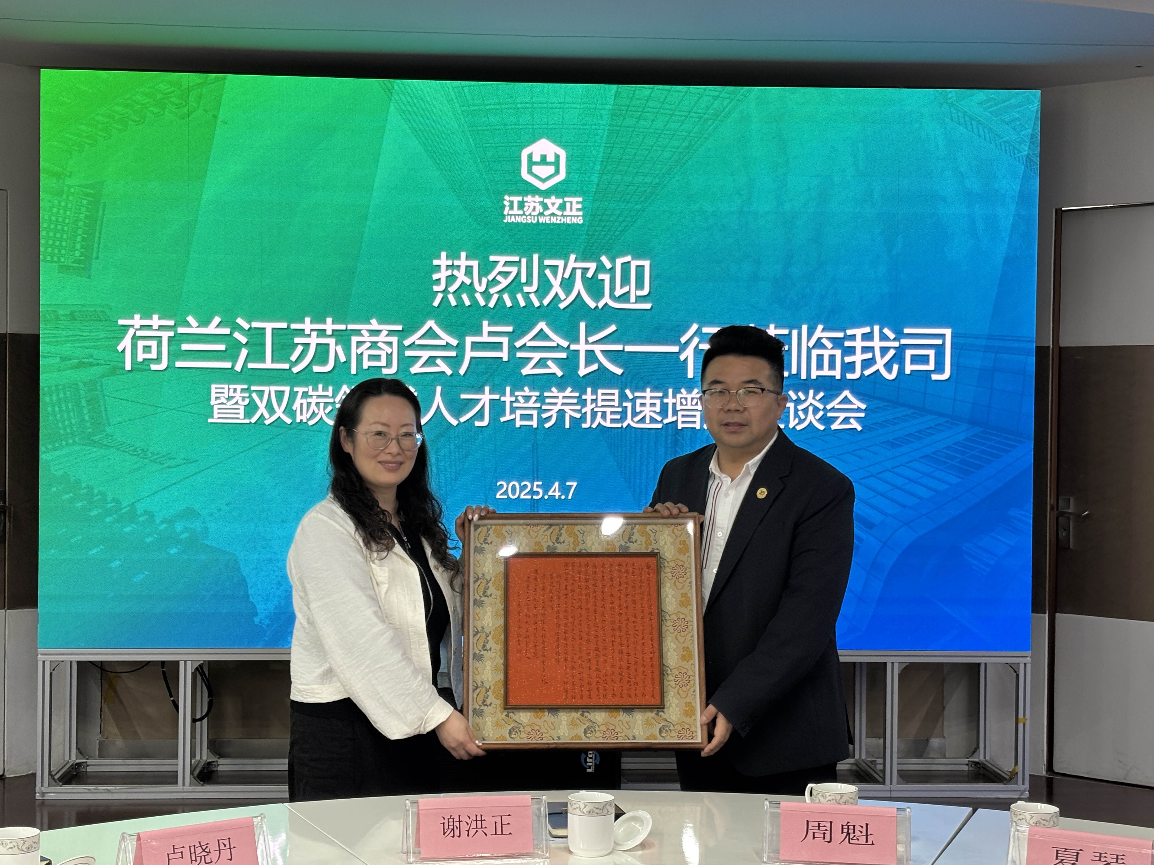 会后,代表团前往卡颂智能壁材有限公司参观,深入了解其自主研发的智能环保壁材产品。卡颂公司负责人展示了壁材在净化空气、调节湿度及低碳环保方面的技术突破,获得代表团的高度评价。